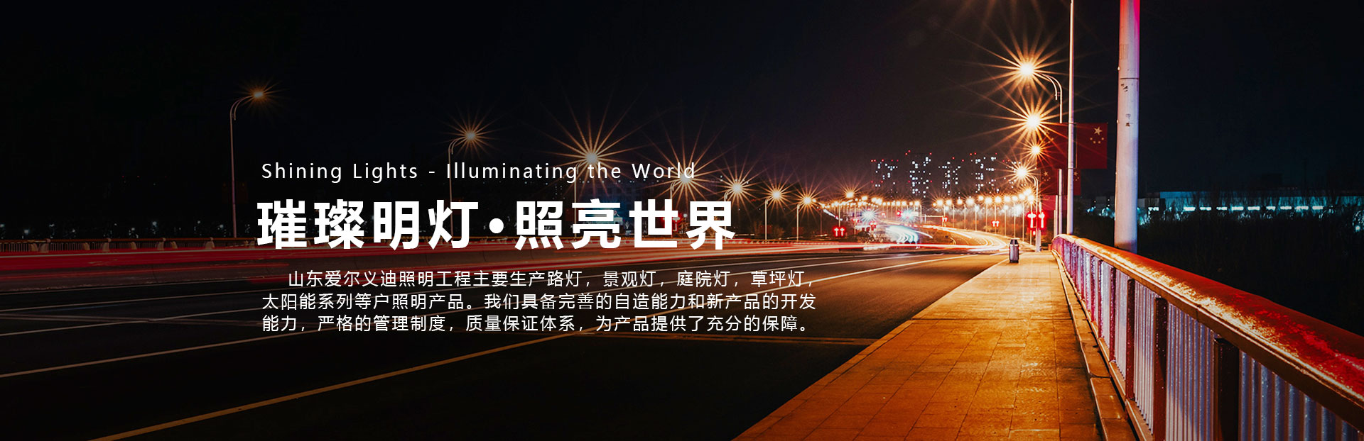 山東愛爾義迪照明工程有限公司專業從事: 專利產品系列 太陽能路燈系列 智慧路燈系列 中華路燈系列 高/中桿燈系列 戶外道路燈系列 鋁型材燈系列 庭院燈系列 景觀燈系列 墻壁燈系列 柱頭燈系列 草坪燈系列 教育照明系列 等產品的生產與銷售。